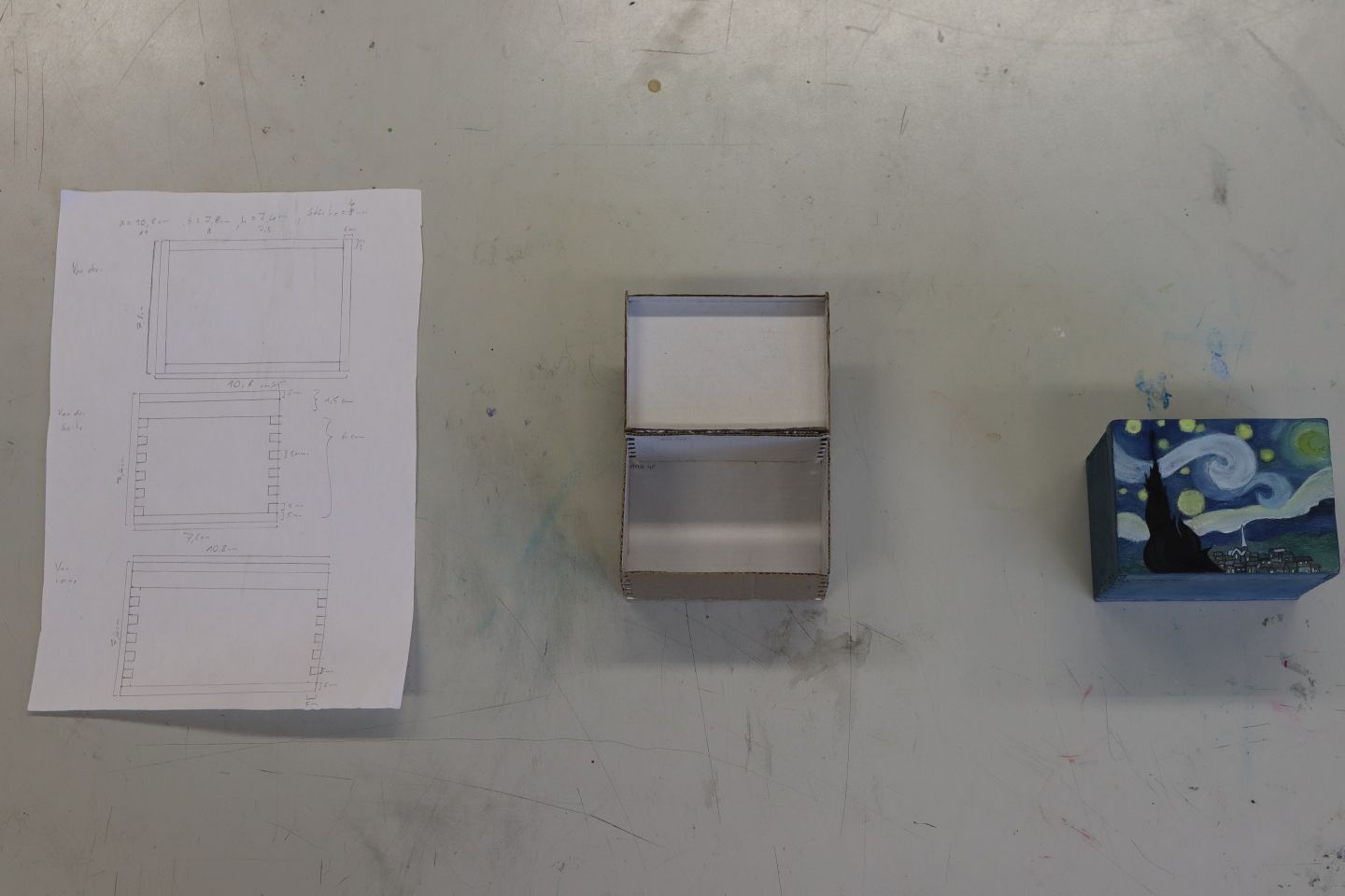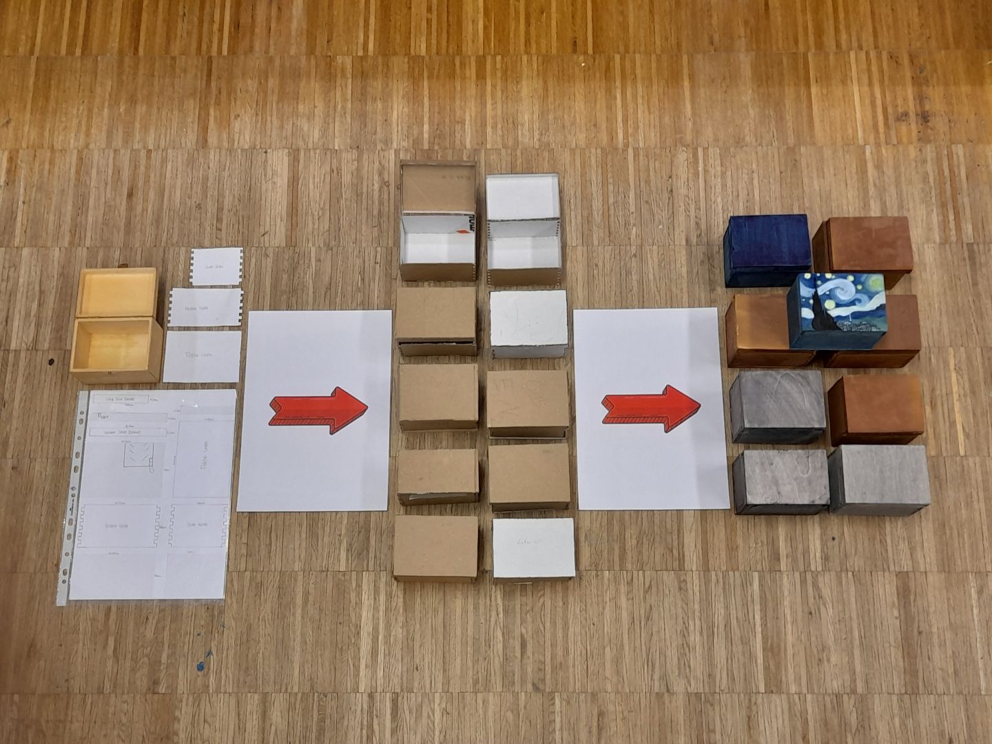Ausgangspunkt war eine Musterkiste, deren Aufbau analysiert wurde. Auf dieser Basis entwarfen die SchülerInnen ihre eigenen Kisten – entweder in denselben Maßen oder individuell angepasst. Die Entwürfe wurden maßstabsgetreu im Format 1:1 gezeichnet, was die räumliche Vorstellungskraft und das technische Zeichnen schulte.