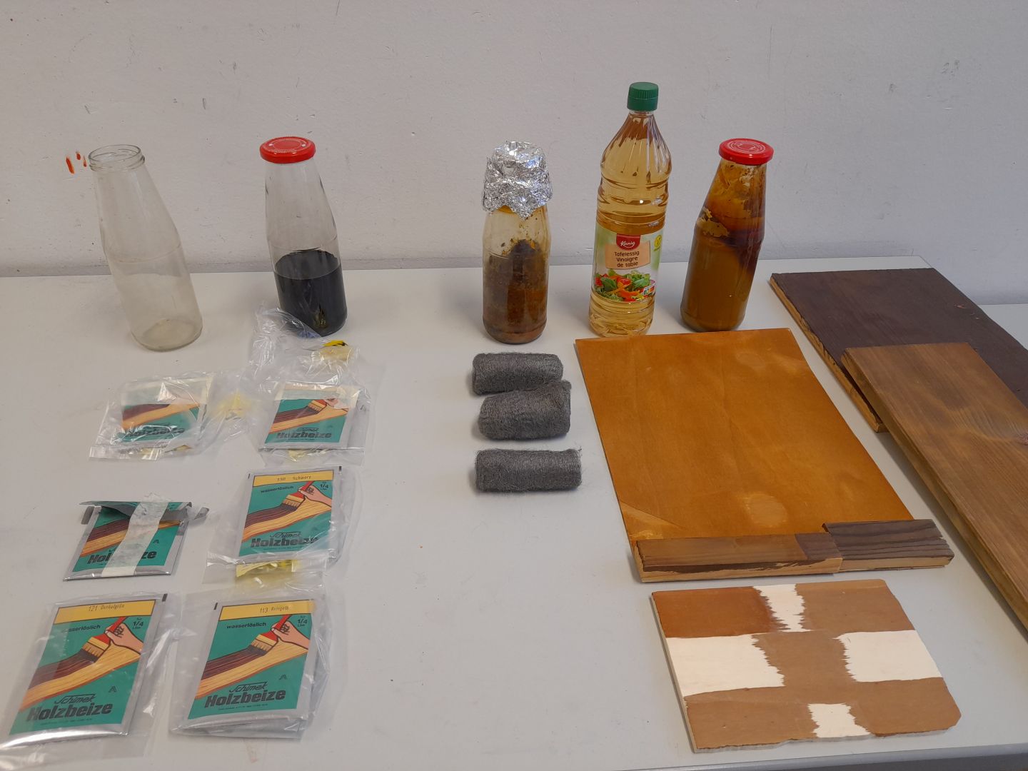 Nach dem Verleimen konnten die Kisten individuell gestaltet werden. Neben sechs wasserbasierten Holzbeizen stand auch eine selbst hergestellte Beize aus Essig und Eisenwolle zur Verfügung. Abschließend wurden Filzböden eingeklebt und einige Kisten kreativ verziert.