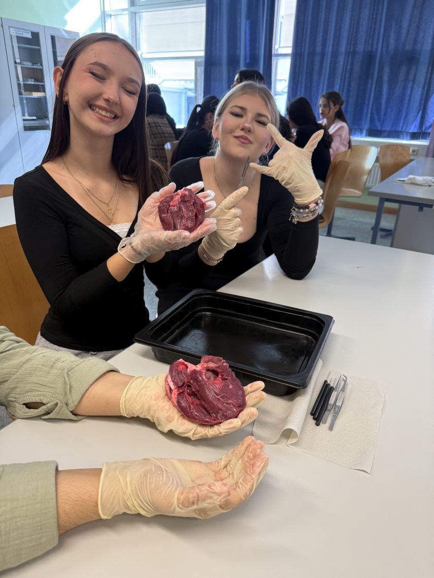 Mit Begeisterung, Interesse und Herzklopfen wurden die frischen Schweineherzen von der 5 D seziert, anatomische Besonderheiten genau untersucht und danach alle Teile wie: Aorta, Vorkammern, Segelklappen und die Hauptkammern mit Skalpell und Pinzette zerlegt.