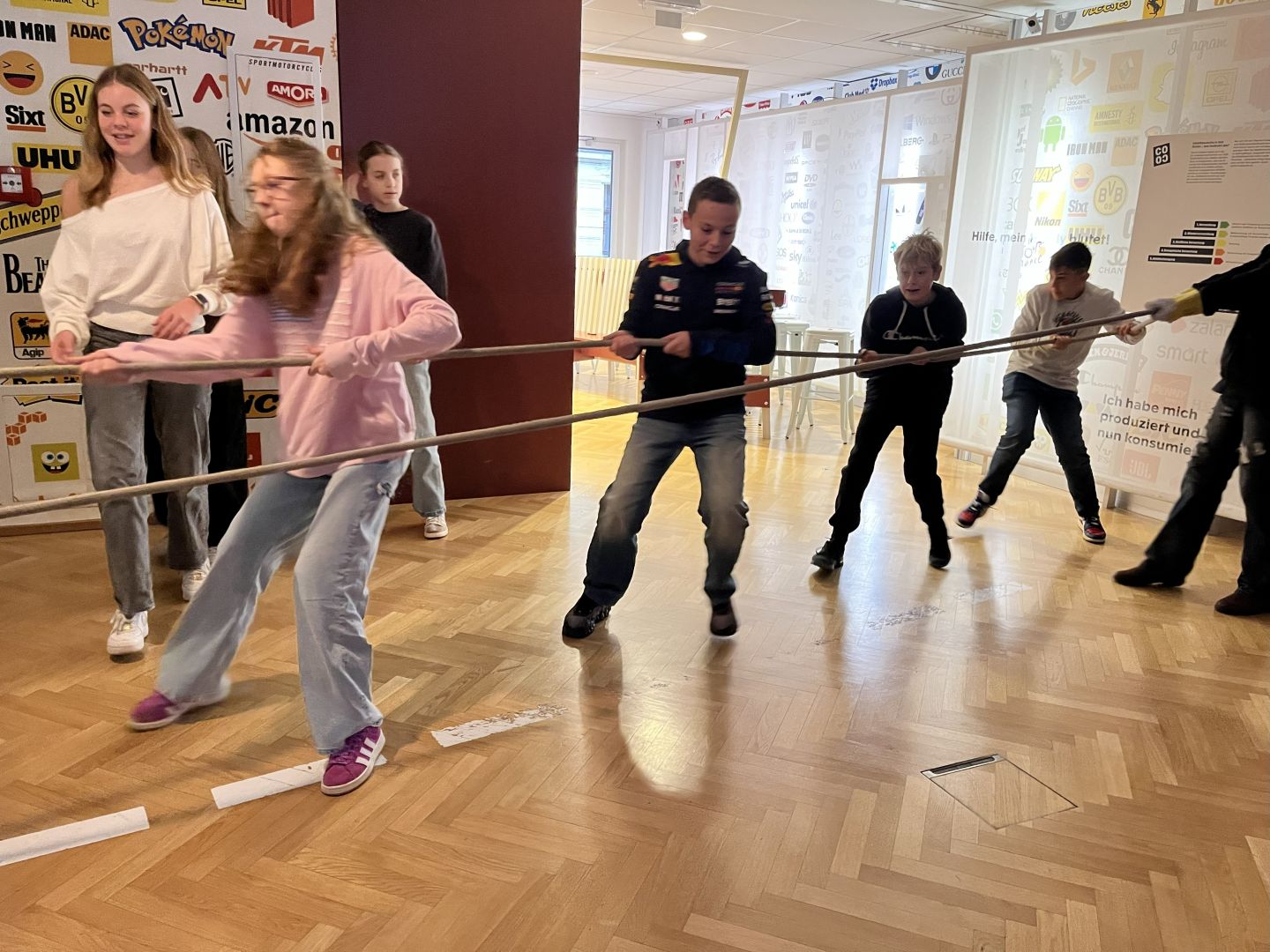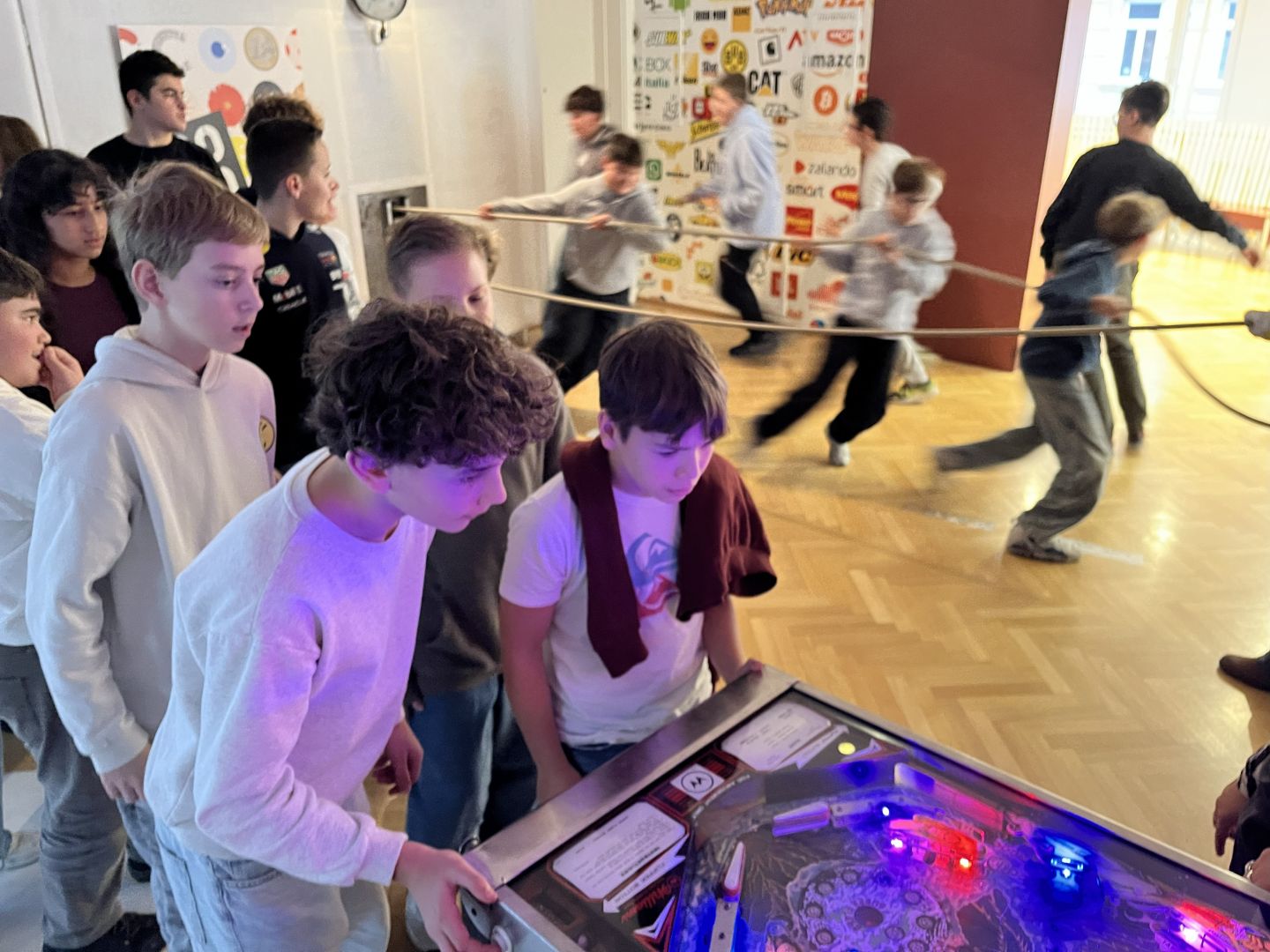 Der zweistündige Workshop bot viel Abwechslung: Es wurde debattiert, experimentiert und gespielt. Ein besonderes Highlight war die Mitmachstation, an der wir mit purer Muskelkraft einen Seilzug bedienen mussten, um einen Flipperautomaten zum Laufen zu bringen.
