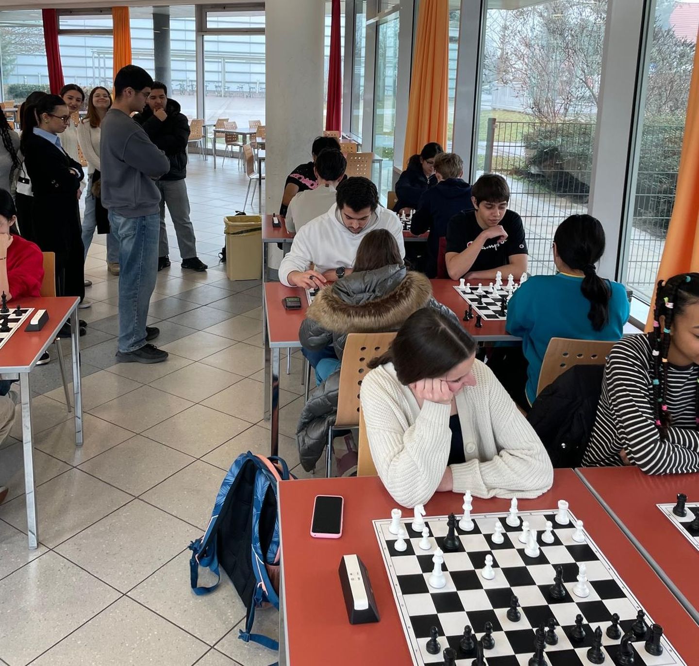 Am 28.1.2026 um 8:00 versammelten sich 16 Schülerinnen und Schüler, die die Kunst des Schachspiels beherrschen, in der Cafeteria unseres Gymnasiums, um ihre Kräfte im Tandem-Schach zu messen. Die Spannung war von der ersten Sekunde an nervenzerreißend, ja die Nerven aller waren gespannt wie Stahlseile einer Hängebrücke im Sturmwind, zwischen den Klippen der Niederlage und den schroffen Felsen des Triumphs.