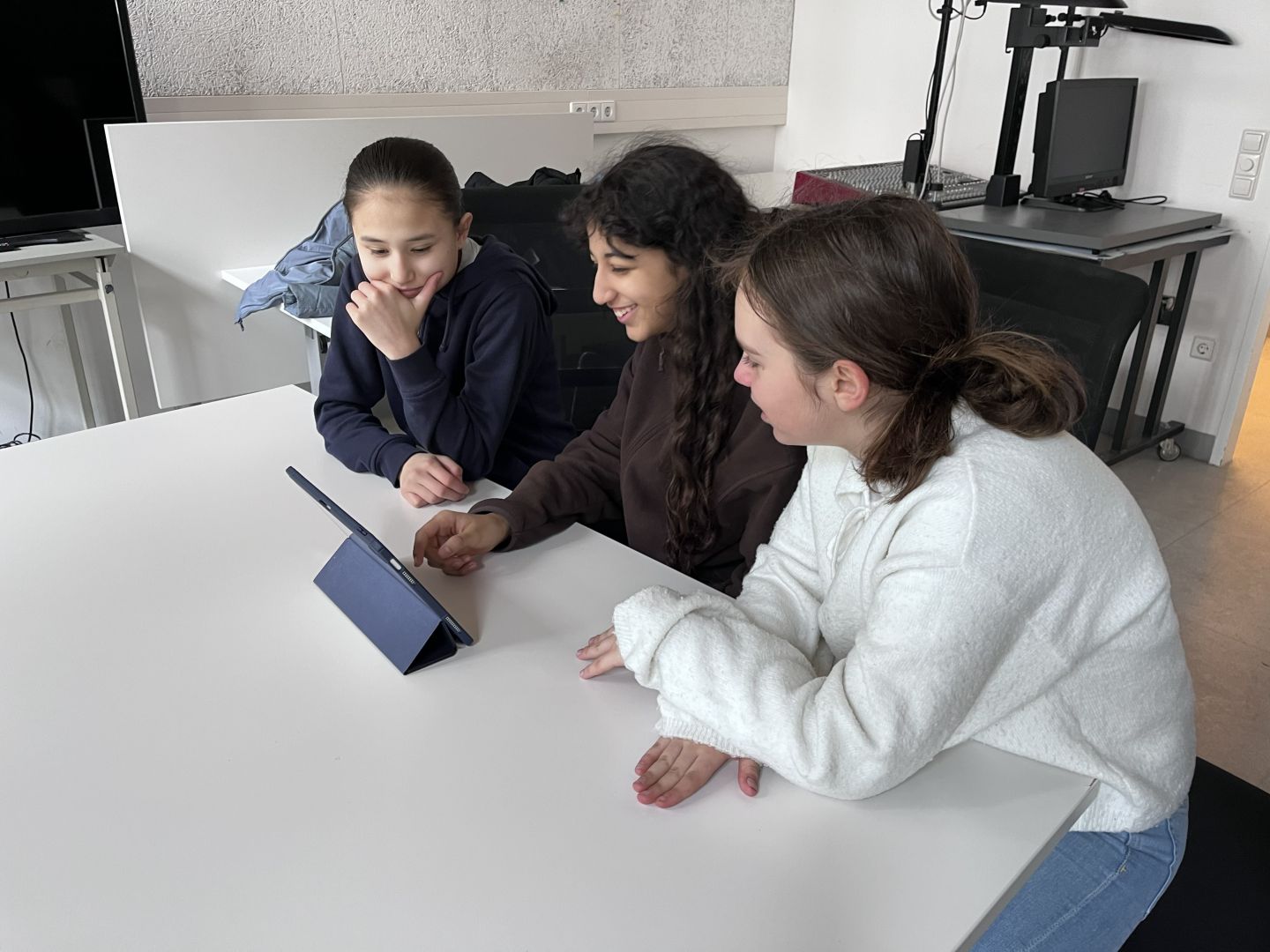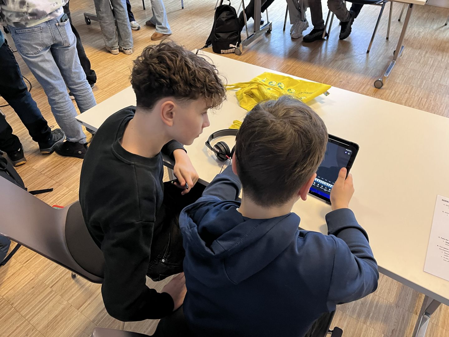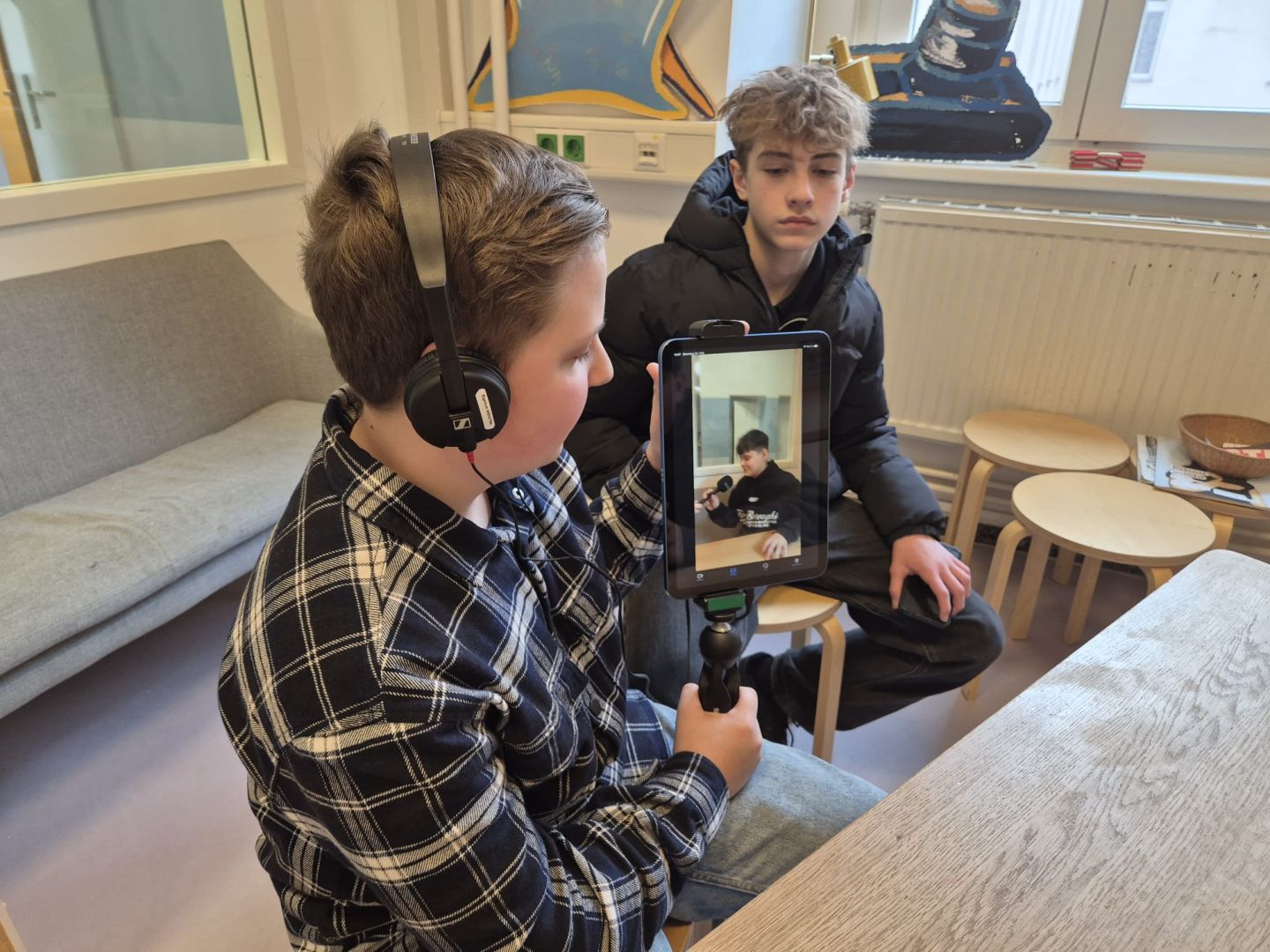 Damit für die praktische Umsetzung vor Ort genügend Zeit blieb, wurden die Beiträge der Schülerinnen und Schüler bereits im Deutschunterricht sorgfältig vorbereitet. Ausgestattet mit iPads, Mikrofonen und Kopfhörern machten sich die Kleingruppen im und rund um das Medienzentrum ans Werk. So entstanden Interviews, Straßenumfragen und kreative Erklärvideos, die nach dem Dreh geschnitten, vertont und schließlich der Klasse präsentiert wurden.