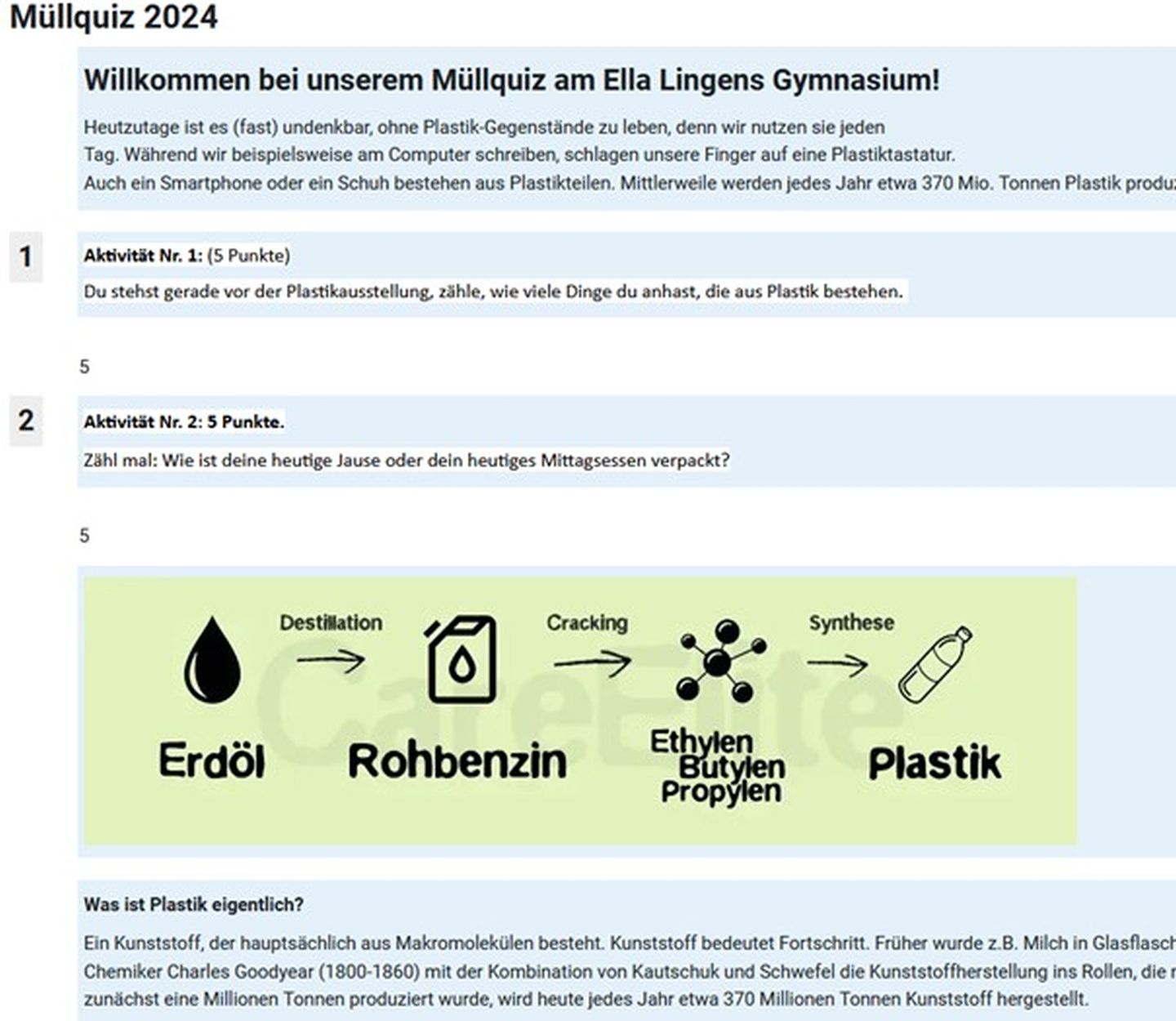 Um uns genau dafür zu sensibilisieren erfährt unser Plastikprojekt eine neue Auflage an einem neuen Ort und diesmal mit einem Onlinequiz von Prof. Günther Sturm und Prof. Driss Tabaalite auf eduvidual! Schüler:innen der Unterstufe sind in diesen Kurs eingeschrieben und können jederzeit das Quiz machen!