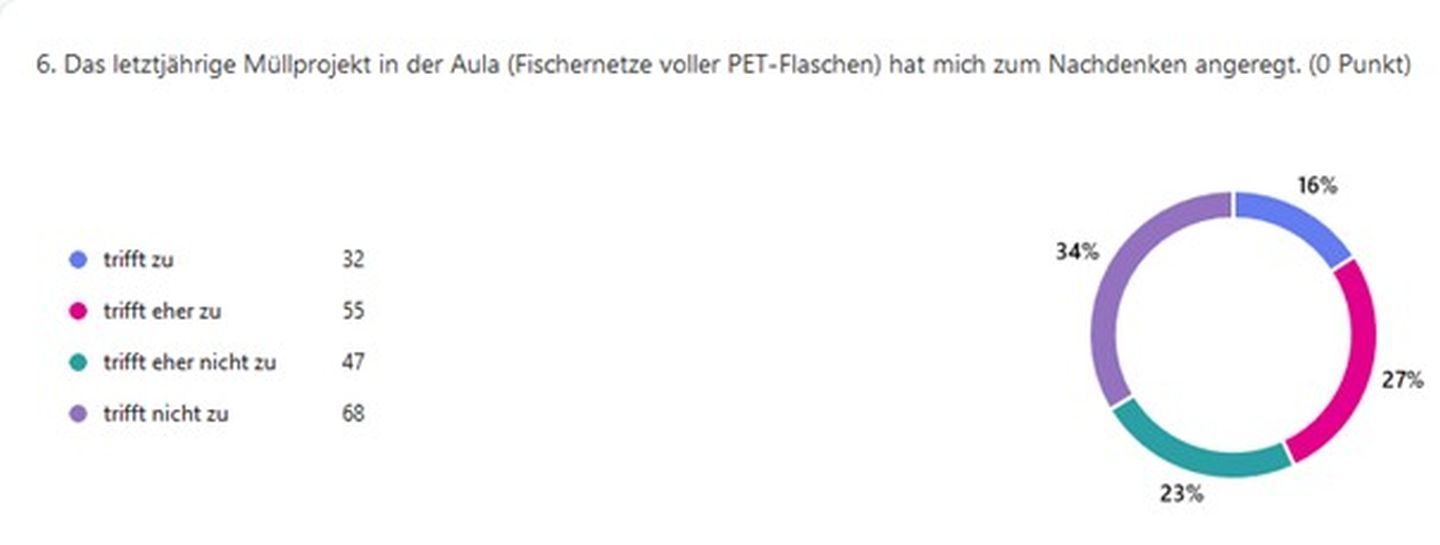 Wer erinnert sich noch an das Plastikmüllprojekt aus dem letzten Schuljahr? 43% der Teilnehmer:innen unserer Mülltrennumfrage haben angegeben, dass sie von unserem Müllmonument zum Nachdenken angeregt wurden.