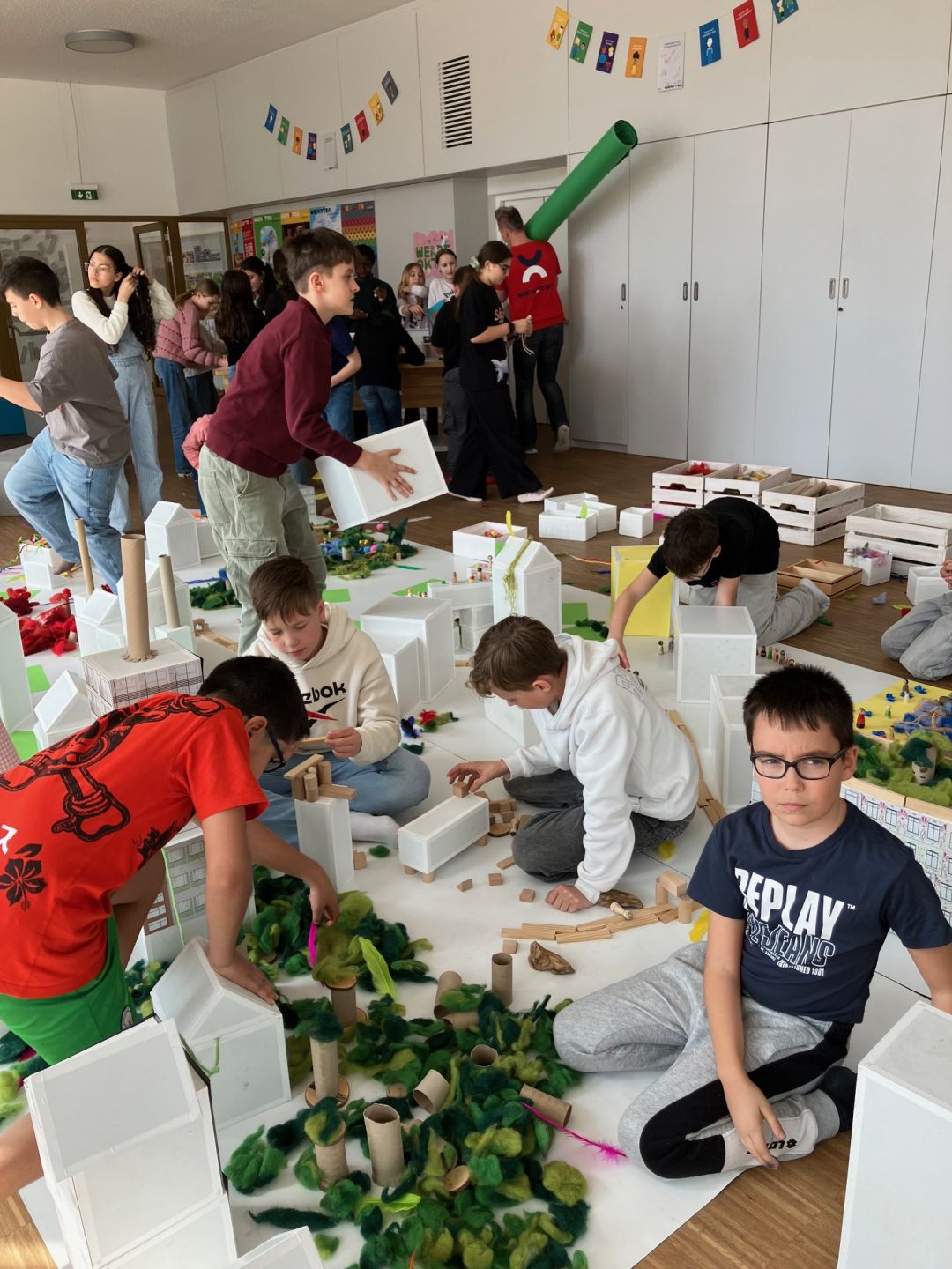Die 1D ging mit vollem Elan und Tatendrang an die Aufgabe heran und wie die Bilder zeigen, entstand ein wunderbares Modell ihrer Traumstadt. Nur einige Highlights daraus: Strand mit Meerzugang, Fußballstadion, Hogwarts durfte nicht fehlen, begrünte Dachterrassen und ein Aussichtsturm mit grandiosem Blick über die ganze Stadt. Schau dir die Fotos genau an, vielleicht entdeckst du ja noch so einige verspielte Details und Sehenswürdigkeiten. Die Klasse hatte sichtlich großen Spaß und der Workshop, samt den betreuenden Mitarbeiter/innen, können wir gerne weiterempfehlen.